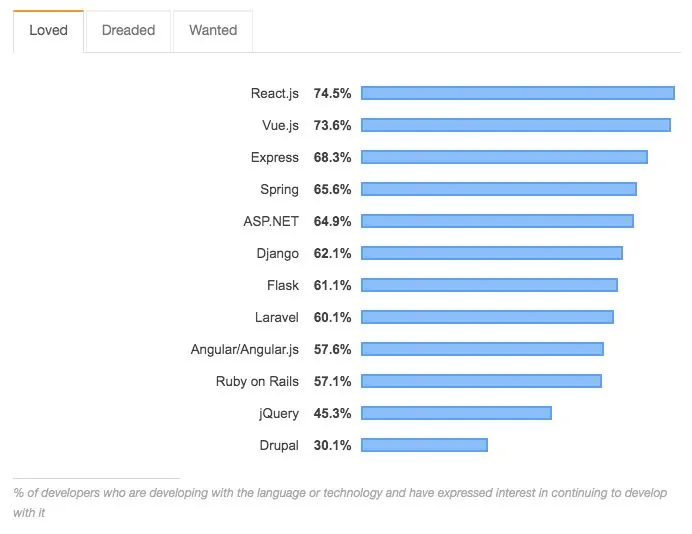 React.js 和 Vue.js 分别成为开发者最喜爱和最想使用的网页框架,而 Drupal 和 jQuery 则最令人害怕。