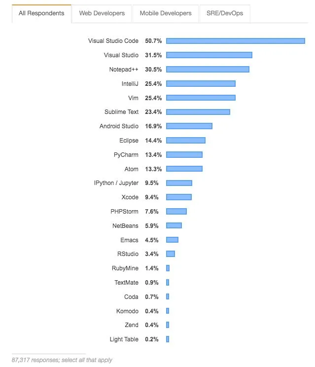 今年,Visual Studio Code 成为最流行的开发者环境。不同类型和角色的开发者会选择不同的环境,不过 Visual Studio Code 在全球范围内成为首选。为移动 app 写代码的开发者更倾向于使用 Android Studio 和 Xcode。运维专家和网站可靠性工程师倾向于使用 Vim,而数据科学家更喜欢使用 IPython/Jupyter、PyCharm 和 RStudio。