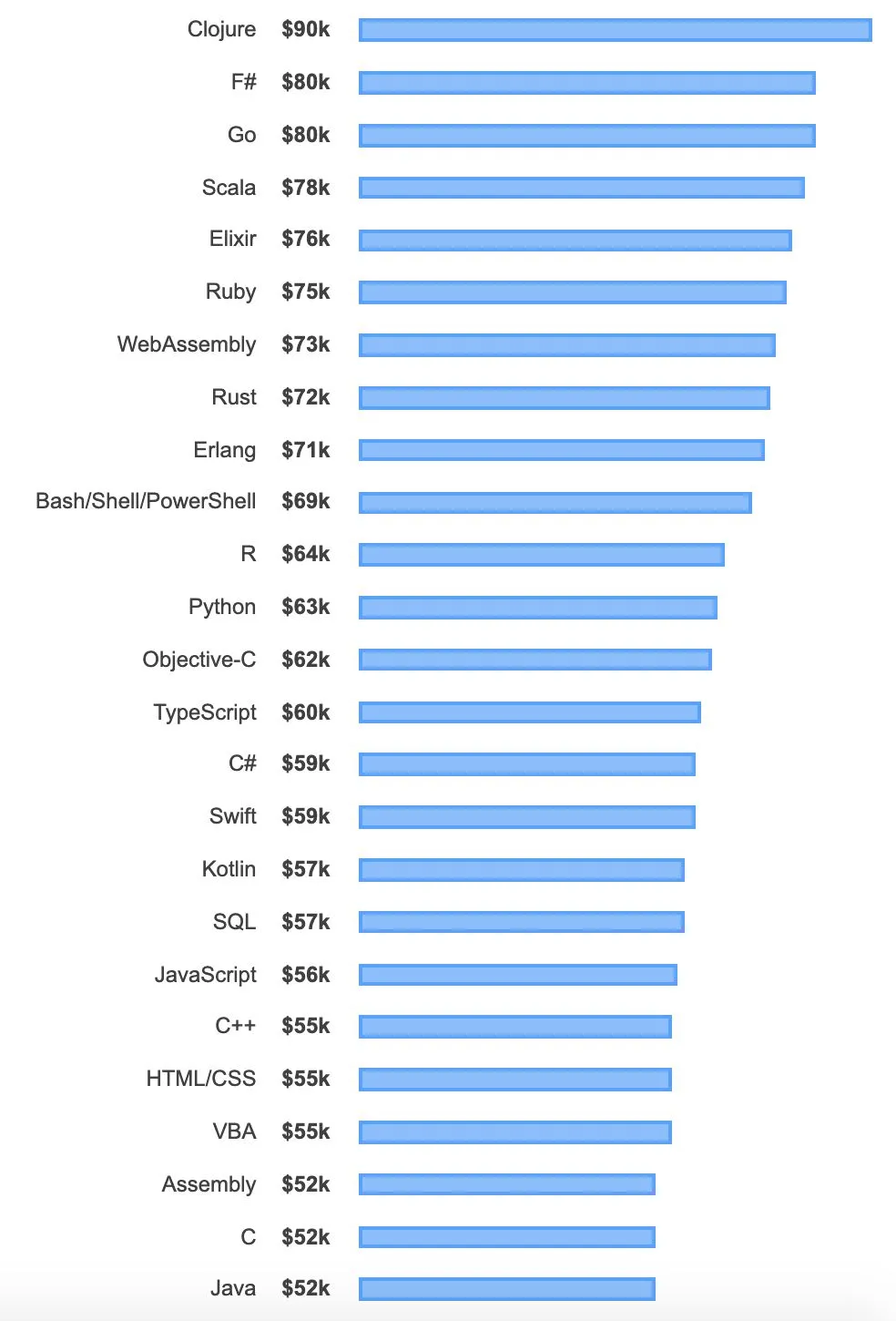 全球范围内,使用 Clojure、F#、Elixir 和 Rust 的开发者工资最高,薪酬中位数超过 7 万美元。最高薪开发者使用的语言因地区而有所不同。在美国,Scala 开发者薪酬最高,而在印度 Clojure 和 Rust 开发者薪酬最高。
