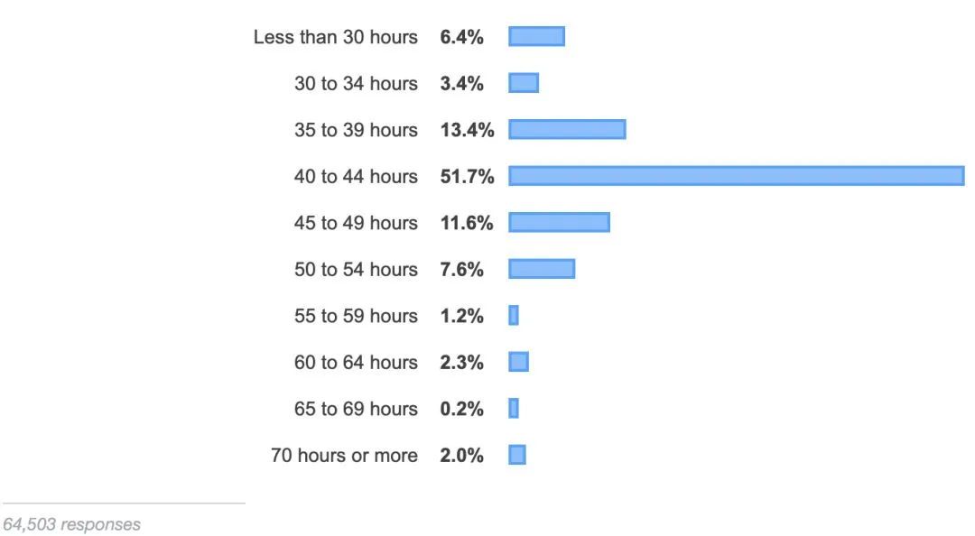 而在最近被热议的工作时间问题上,这份覆盖了全球 179 个国家和地区、接近 9 万名软件开发者的统计告诉我们,996 并不是什么码农的代名词:有超过 50% 的开发者每周的工作时间为 40-44 小时,而每周工作超过 70 小时的人数仅为 2%。
