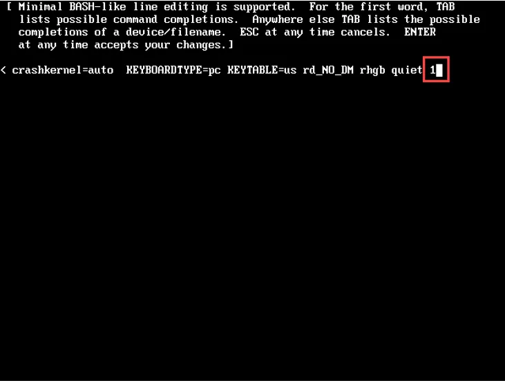 键入 a 进入内核编辑模式,在 quiet后键入 空格(注意空格) l: