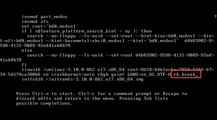 然后将光标选定到第一个,键入e进入编辑模式,在linux16 一行最后 键入 空格 rd.break 然后 ctrl + x 启动,进入救援模式: