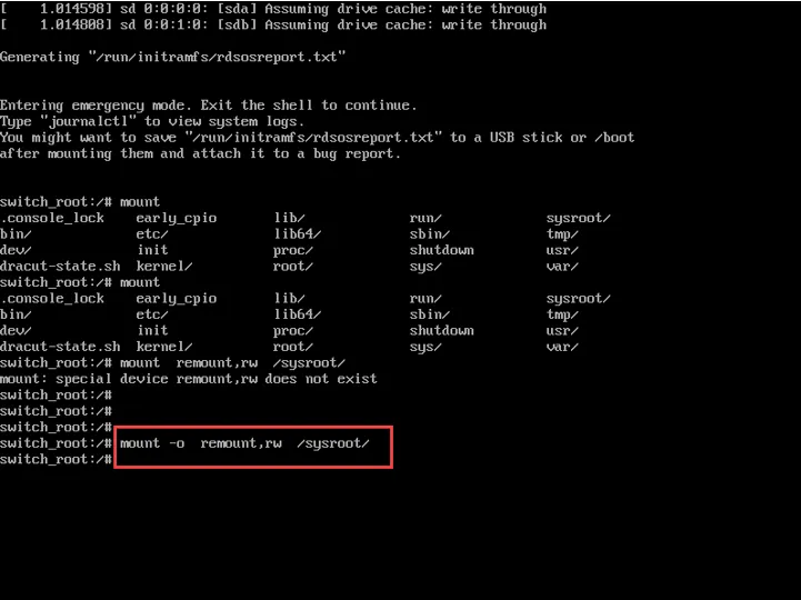 在救援模式下,先使用 mount -o remount,rw /sysroot 以读写权限重新挂载/sysroot目录,然后使用chroot /sysroot/切换至 /sysroot目录下: