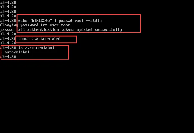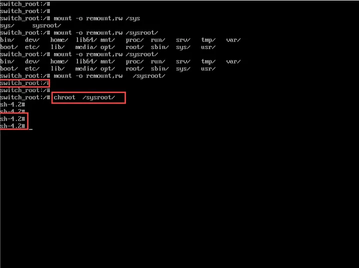 可以看到在输入chroot命令后,用户提示符由 switch_root# 变为了 sh#,此时我们就可以修改密码了;