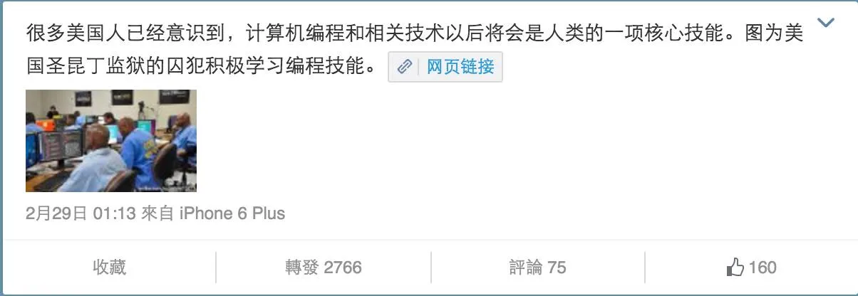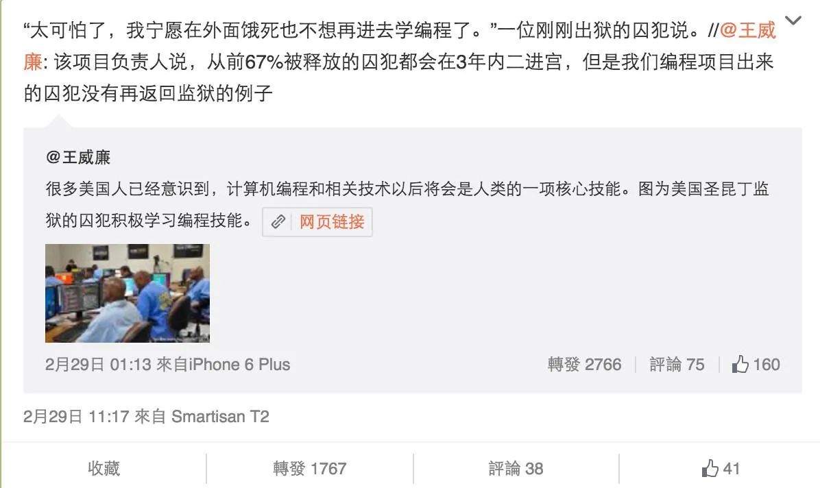 虎嗅注:今天,微博帐号@王威廉 一条关于美国圣昆丁监狱的囚犯积极学习编程技能的微博受到关注: