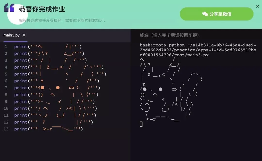 潘石屹前段时间也连发三条微博,把学习Python当成自己的人生礼物。对此,众网友猜测:他说不定是看了朋友圈的Python广告才决定去学的。为了对此类课程一探究竟,36氪作者报名参与了8.9元的体验课。和很多网络课程一样,首先要添加一名助教老师,并拉入同期的学习群,该群主要为实操课答疑、每日认知课学习、学员之间的交流以及学习打卡,这次作者所在的群为227人。体验课的学习周期为6天,一共设置了4个关卡,学习进度可以自己把握,大概25-30分钟可以学完1关。需通过电脑或者平板上课,课程并不是视频或者直播,而是文字交互式的,每个人的学习是独立的,学完一关才能进入下一关,类似游戏升级。