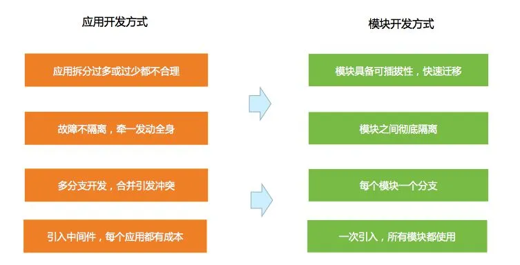 模块化开发,模块之间互相隔离,实现故障隔离。