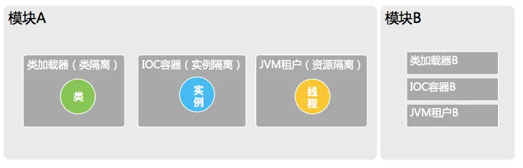 类隔离:框架为每个模块的Class使用单独的ClassLoader来加载,每个模块可以依赖同一种框架的不同的版本。