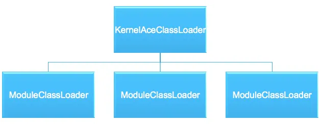OSGI类加载机制的关系采用的是网状结构,每个模块通过 Export-Package 来声明我要给别人用哪些类,通过 Import-Package来声明我要用别人的哪些类。JarsLink采用扁平化管理,每个模块都有一个共同的父类,这个父类加载器就是加载ModuleLoader类的加载器,如果是SOFA应用,模块的父加载器是KernelAceClassLoader,类加载器关系如下: