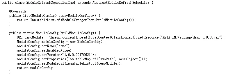 使用JarsLink API非常简单,只需要继承AbstractModuleRefreshScheduler,并提供模块的配置信息,代码如下: