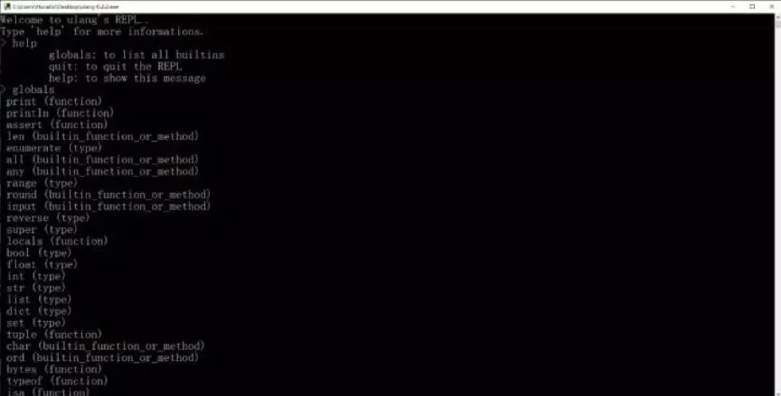 如图所示,打开木兰语言环境后,首先呈现的是类似命令行的编程环境,它的函数很多和Python一致。在编程界面中,键入help,并没有找到更多的编程语言文档。