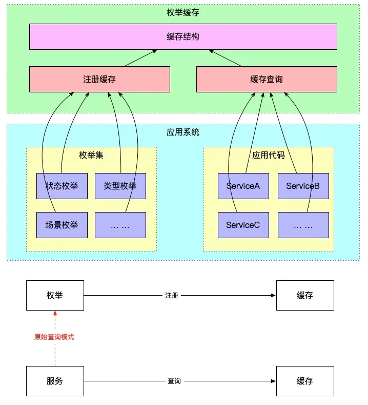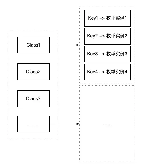如果我们入StatusEnum创建枚举,那么在应用系统启动的过程中StatusEnum的静态块可能从未执行过,则枚举缓存注册失败,所有我们需要考虑延迟注册,代码如下:private static <E extends Enum> void executeEnumStatic(Class<E> clazz) { if (!LOADED.containsKey(clazz)) { synchronized (clazz) { if (!LOADED.containsKey(clazz)) { try { // 目的是让枚举类的static块运行,static块没有执行完是会阻塞在此的 Class.forName(clazz.getName()); LOADED.put(clazz, true); } catch (Exception e) { throw new RuntimeException(e); } } } } }