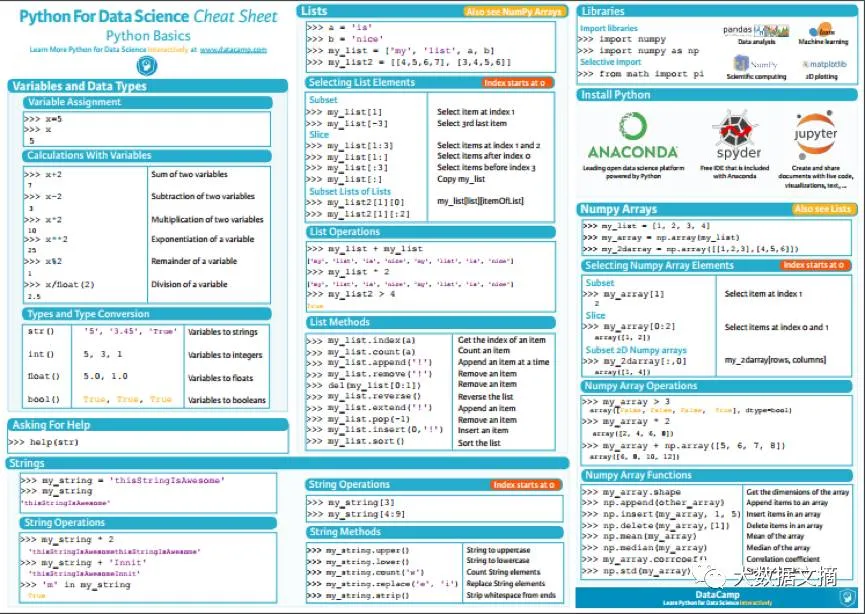 在这张Python小抄表里,已经囊括了Python的相关介绍:变量,数据类型,字符串,列表,并最终落实到Python的基本科学计算包。