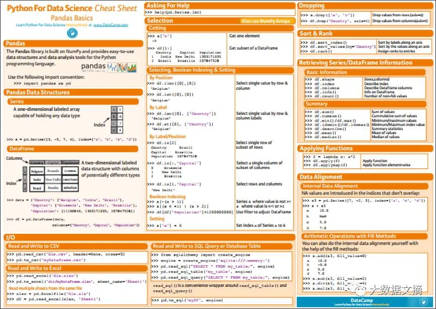 Pandas小抄表会带着你一览Pandas包的基础知识:从数据结构到输入/输出,数据选择,下降指数(dropping indices or columns),数据整理和排序,获取所用数据结构的基本信息,到数据操作的功能应用、数据对齐等等。这可是新手上路的必备手册噢!