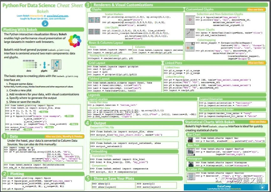 借助这份Bokeh小抄表,会让你很快地熟悉基本统计图表的制作过程:如何准备数据,创建图表,添加自定义的可视化数据的渲染器,输出图表并且保存或者展示。