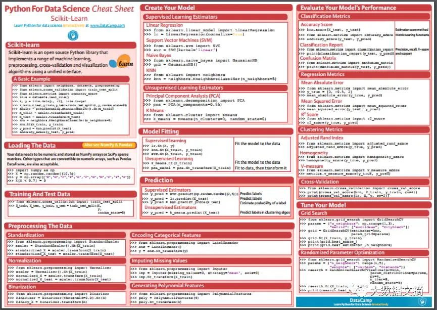 简而言之,这张小抄表将会启动你的数据科学项目:借助示例的代码,你可以立刻开始创建、验证和调整你的机器学习模型。