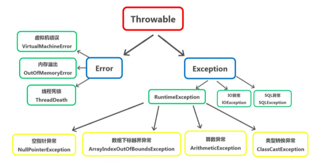 Throwable是Java语言中所有错误或异常的超类。下一层分为Error 和Exception。是指java运行时系统的内部错误和资源耗尽错误。应用程序不会抛出该类对象。如果出现了这样的错误,除了告知用户,剩下的就是尽力使程序安全的终止。Exception包含:RuntimeException、CheckedException;编程错误可以分成三类:语法错误、逻辑错误和运行错误。语法错误(也称编译错误)是在编译过程中出现的错误,由编译器检查发现语法错误。逻辑错误指程序的执行结果与预期不符,可以通过调试定位并发现错误的原因。运行错误是引起程序非正常终端的错误,需要通过异常处理的方式处理运行错误。RuntimeException:运行时异常,程序应该从逻辑角度尽可能避免这类异常的发生。如NullPointerException、ClassCastException ;CheckedException:受检异常,程序使用trycatch进行捕捉处理;如IOException、SQLException、NotFoundException;