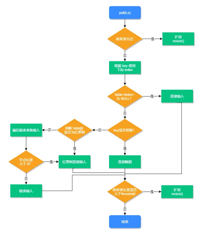 7、插入完成之后判断当前节点数是否大于阈值,若大于,则扩容为原数组的二倍;通过hash函数(优质因子31循环累加)先拿到key的hashcode,是一个32位的值,然后让hashcode的高16位和低16位进行异或操作。该函数也称为扰动函数,做到尽可能降低hash碰撞,通过尾插法进行插入。先做对数组的⻓度取模运算,得到的余数才能⽤来要存放的位置也就是对应的数组下标。这个数组下标的计算⽅法是“ (n - 1) & hash ”。(n代表数组⻓度)。方便数组的扩容和增删改时的取模。底层是 数组和链表 结合在⼀起使⽤也就是链表散列。如果相同的话,直接覆盖,不相同就通过拉链法解决冲突。扩容翻转时顺序不一致使用头插法会产生死循环,导致cpu100%底层数据结构上采用了数组+链表+红黑树;当链表⻓度⼤于阈值(默认为 8-泊松分布),数组的⻓度大于 64时,链表将转化为红⿊树,以减少搜索时间。(解决了tomcat臭名昭著的url参数dos攻击问题)4、ConcurrentHashMap