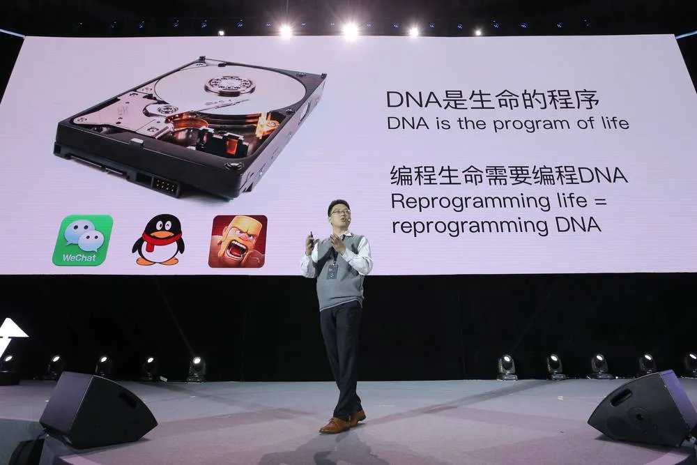 (很不幸的告诉你,因为他讲的太好了,所以我没有对他的演讲进行任何删节,这是今天9位嘉宾演讲中唯一一个没有删节的演讲。因为他讲得基因变成跟我们每个人都息息相关,作为最后一个演讲的人,此时已经有人陆陆续续走了,甚至即使很多在座的人也开始不耐放拿着手机玩起来。但是,当他讲到中途的时候,连上面讲人造蛋的那个家伙也可以聚精会神听了起来,包括坐在我后排的那几位科学家。最后他演讲结束的时候,现场给出了非常热烈的掌声。所以,我决定不删节了,哪怕你看不懂,但万一有科学家看到这篇文章呢?哪怕只有一个看到,我觉得,也不能删。)我的标题是编程生命,看到这个标题你也许会感到有一些疑惑,生命不是机器,我们怎么编程呢?我们为什么要编程生命,我们又该如何编程呢?我是一名生物工程师,在过去的10多年间我一直在思考如何编程生命,如何让人活得更加健康,作为一名工程师,我其实有时候非常羡慕我的同行IT工程师,在过去30年他们利用自己的智慧和创造已经彻底改变了我们的世界,从个人电脑到智能手机,到今天无人驾驶汽车,IT工程师们的创造已经进入到了我们生活的方方面面,跟他们比起来生命工程师的创造要小得多。我们有很多梦想,但是很多都在路上,比如说30年前我们就在梦想着使用基因来治疗疾病,攻克那些从来没有办法攻克的疾病,但是到今天这仍然是一个梦想。在这里我想说生物可以已经飞速发展了,有很多梦想在不久的将来即将成为现实。借用一个词,科技照亮了我们的梦想,帮助我们把它变成了现实。如果说IT是在高速上已经飞速行使了30年的话,那么生物科技也即将驶入这条高速路,虽然说现在速度不是很大,但是加速度很大,那么在将来它必将一样高速行使。当我们编程生命的时候,我们要考虑什么呢?其实很有意思的是我们看一下编程计算机,当我们编程计算机的时候我们希望计算机变得越来越有智能,越来越聪明,就像我们人一样,所以我们叫做人工智能,但是当我们编程生命的时候我们是反的,我们希望生命变得越来越简单、越来越容易被控制,产生我们期待的结果。所以这两条不同的编程通路最终是会合的,区别是计算机是我们人创造的,我们知道计算机的每一个细节,当它出现问题的时候,我们如何去修整,但是生命不是我们创造的,大自然创造了生命,到今天为止我们知道的非常的有限,当我们面对一个复杂的生命,我们面对的是一个巨大的黑盒子,很多时候我们只能猜测下面该怎么做,但是面对这样一个黑盒子我们可以编程吗?生命科学的进展告诉我们生命的程序是基因,基因的基本形态是DNA,DNA编码了2NA,2NA又编码了蛋白,蛋白产生了复杂的功能,信息的横向流动构成了我们的生命,在每一个人体内都有这样的DNA、RNA和蛋白的分子,一旦这种生命横向信息的流动出错我们就会得病,不仅仅如此生命还有纵向信息的流动,DNA从一代传给下一代,从爸爸妈妈传给孩子们,如果这个过程出错人们就会得遗传病。当我们编程计算机的时候,我们希望把计算机里面的程序改写,产生非常复杂的功能,比如说我们今天常用的聊天软件和一些好玩的游戏,但是当我们编程生命的时候,我们应该怎么考虑,我们需要什么样的功能,我们能够通过编程NDA来治疗我们的疾病,帮助我们预防更多可怕的疾病。当我们在编程生命的时候,首先我们需要知道这套程序原来是什么,我们需要读取这套程序,这个过程叫做基因测试。我在来之前专门看了一下这个视频受到了很多启发,王俊博士说基因测序的价格会大大的下降,它当时数据显示到了2012年,我把最近3年的数据找到了放在这里,大家可以看到基因测序的价格的确下降的非常快,超过摩尔定律,虽然还没有完全的免费,但是大家感觉到基因测序就在你自己的身边随手可得。但是基因测序只是编程生命的第一步,比如你去医院做了很多检测和诊断,目的是为了后期的治疗,治好这个疾病。同样的,对于基因,读取是为了改写,那么我们的问题是如果DNA是生命的程序,除了读我们还能够写吗,我们可以设想一下人体是一台计算机,那就是一台DNA的计算机,一台生命信息的计算机,我们能否像计算机一样,给人体添加一些按纽,比如说其中一个按纽是更改,当按下这个按纽的时候任何发生错误的DNA就会发生自动的修复,帮助我们纠正这些疾病。再比如另外一个按纽删除,可以帮助我们删除不想要的基因,比如说感染的病毒,另外还科技有打开或者是关闭基因的按纽,帮助我们调整这些基因的功能。如果有一天我们可以把人体做成这样的计算机,我相信很多疾病我们不再感到害怕,很幸运的是最近几年出现了 一项新的技术叫做CRISPR,CRISPR它在今天却是生物工程师眼中的希望,是人们用来攻克很难的疾病的希望,CRISPR是什么,简单的说它就是一把剪刀,是一把DNA的分子手术刀,可以帮我们请确的剪切基因的某一个位置。CRISPR有一个蛋白和ROA构成,这个蛋白是从细菌中发现的叫做dCas9,本来的功能是细菌与细菌的敌人进行作战的武器,那细菌的敌人就是感染细菌的病毒,细菌通过使用这个蛋白可以精确的把它不喜欢的病毒给剪切掉去除。而这个精确性来自于与dCas9结合的ROA,叫做想到ROA,大家可以打一个比方,向导为ROA像一个卫星导航系统,可以精确的把这把分子见到带到基因相应的位置剪切一下,而细胞有一个非常神奇的功能,就是基因修