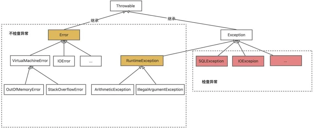 - 其中异常类Exception又分为运行时异常(RuntimeException)和非运行时异常, 这两种异常有很大的区别,也称之为非检查异常(Unchecked Exception)和检查异常(Checked Exception),其中Error类及其子类也是非检查异常。