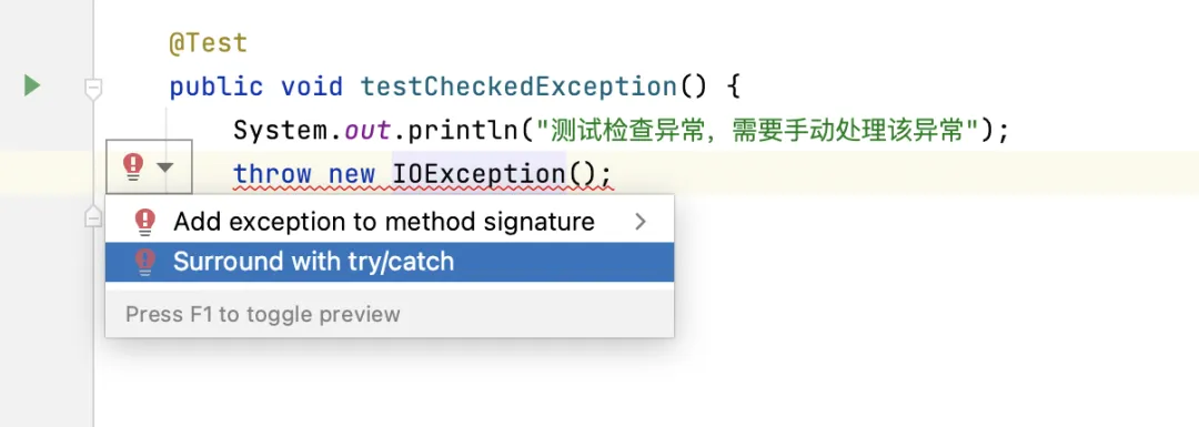 - 检查异常:也称为“编译时异常”,编译器在编译期间检查的那些异常。由于编译器“检查”这些异常以确保它们得到处理,因此称为“检查异常”。如果抛出检查异常,那么编译器会报错,需要开发人员手动处理该异常,要么捕获,要么重新抛出。除了RuntimeException之外,所有直接继承 Exception 的异常都是检查异常。