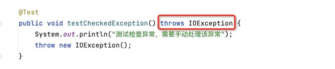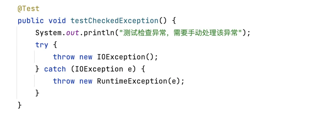 在代码中使用 throw 关键字手动抛出一个检查异常,编译器提示错误,如下图所示:通过编译器提示,有两种方式处理检查异常,要么将异常添加到方法签名上,要么捕获异常:方式一:将异常添加到方法签名上,通过 throws 关键字抛出异常,由调用该方法的方法处理该异常:方式二:使用 try-catch 捕获异常,在 catch 代码块中处理该异常,下面的代码是将检查异常包装在非检查异常中重新抛出,这样编译器就不会提示错误了,关于如何处理异常后面会详细介绍:非检查异常举例