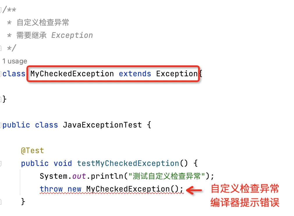 所有继承 RuntimeException 的异常都是非检查异常,直接抛出非检查异常编译器不会提示错误:自定义检查异常
