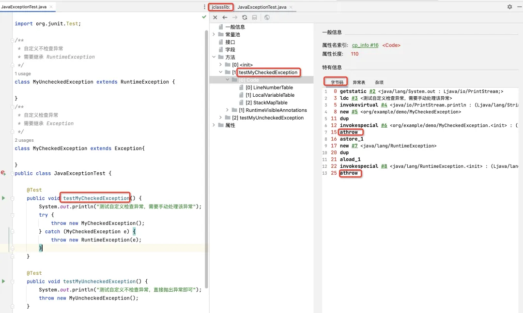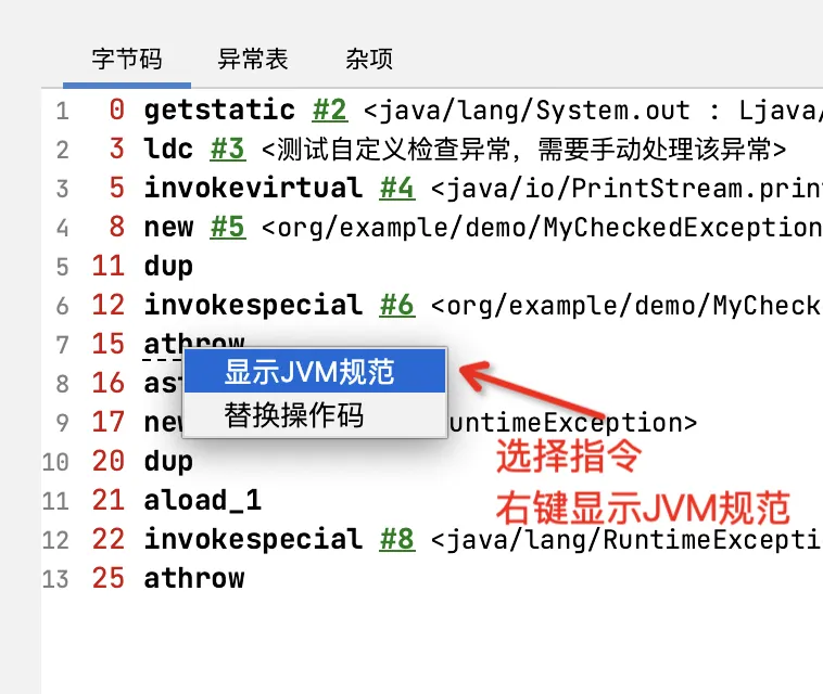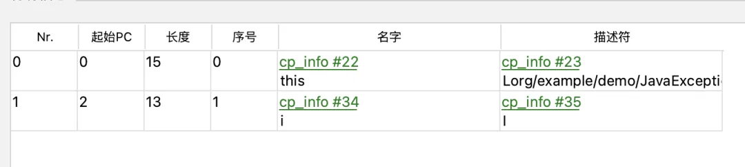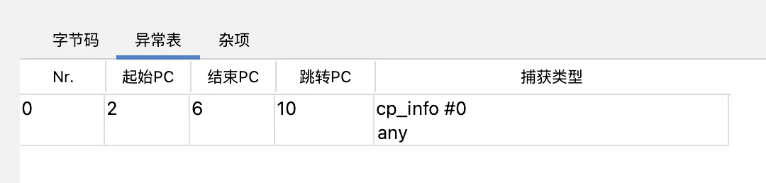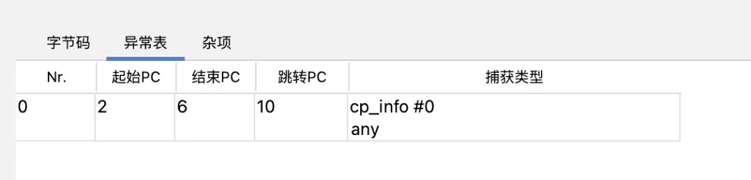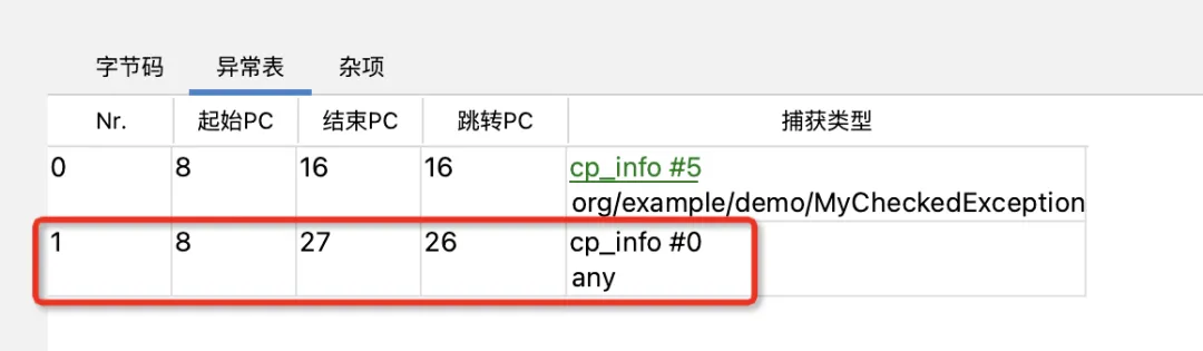 异常表:异常表中用来记录程序计数器的位置和异常类型。如上图所示,表示的意思是:如果在 8 到 16 (不包括16)之间的指令抛出的异常匹配 MyCheckedException 类型的异常,那么程序跳转到16 的位置继续执行。