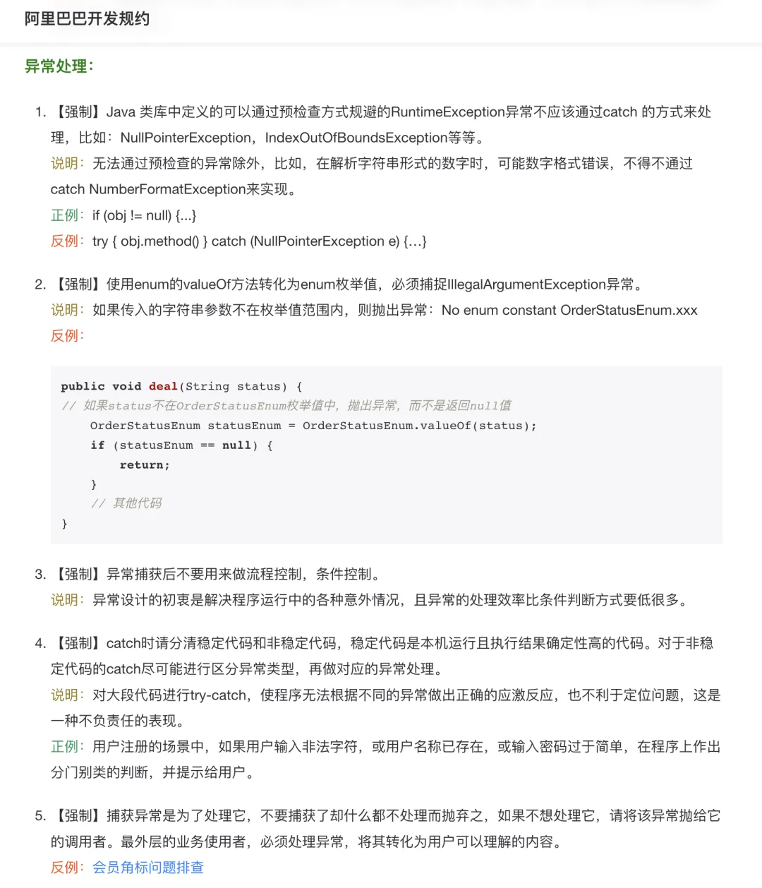 try{ try{ try{ …… } catch (Biz1Exception e){ log.error(e); // 重复的LOG记录 throw new e; } try{ …… } catch (Biz2Exception e){ …… // 同样是业务异常,既在内层处理,又在外层处理 } } catch (BizException e){ log.error(e); // 重复的LOG记录 throw e; }} catch (Exception e){ // 通吃所有类型的异常 log.error(e.getMessage(),e);}