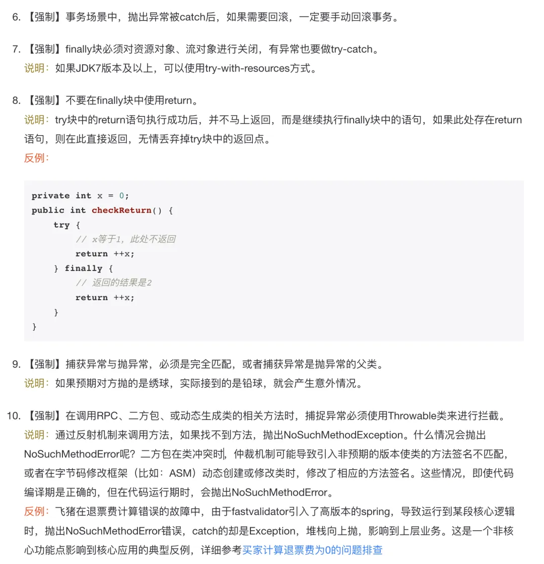 1、使用 try-with-resource 关闭资源。2、抛出具体的异常而不是 Exception,并在注释中使用 @throw 进行说明。3、捕获异常后使用描述性语言记录错误信息,如果是调用外部服务最好是包括入参和出参。 logger.error("说明信息,异常信息:{}", e.getMessage(), e)