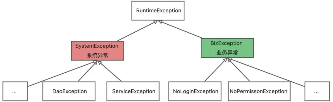 - 业务异常:用户能够看懂并且能够处理的异常,比如用户没有登录,提示用户登录即可。
