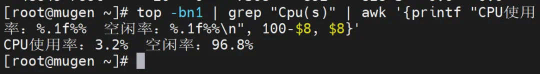 [root@mugen ~]# top -bn1 | grep "Cpu(s)" | awk '{printf "CPU使用率:%.1f%% 空闲率:%.1f%%\n", 100-$8, $8}'
