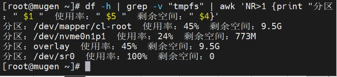 [root@mugen ~]# df -h | grep -v "tmpfs" | awk 'NR>1 {print "分区:" $1 " 使用率:" $5 " 剩余空间:" $4}'