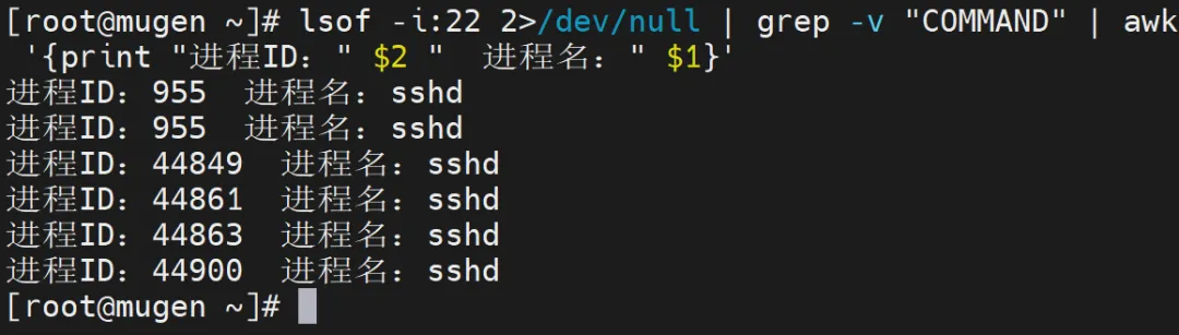 [root@mugen ~]# lsof -i:22 2>/dev/null | grep -v "COMMAND" | awk '{print "进程ID:" $2 " 进程名:" $1}'