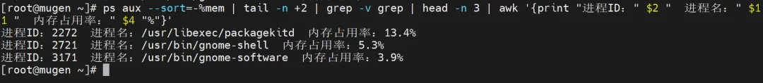 [root@mugen ~]# ps aux --sort=-%mem | tail -n +2 | grep -v grep | head -n 3 | awk '{print "进程ID:" $2 " 进程名:" $11 " 内存占用率:" $4 "%"}'