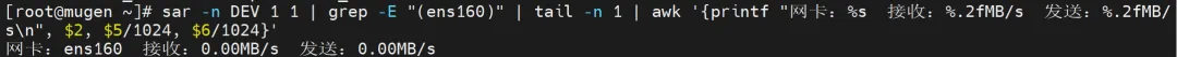 [root@mugen ~]# sar -n DEV 1 1 | grep -E "(ens160)" | tail -n 1 | awk '{printf "网卡:%s 接收:%.2fMB/s 发送:%.2fMB/s\n", $2, $5/1024, $6/1024}'