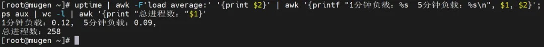 [root@mugen ~]# uptime | awk -F'load average:' '{print $2}' | awk '{printf "1分钟负载:%s 5分钟负载:%s\n", $1, $2}'; ps aux | wc -l | awk '{print "总进程数:"$1}'