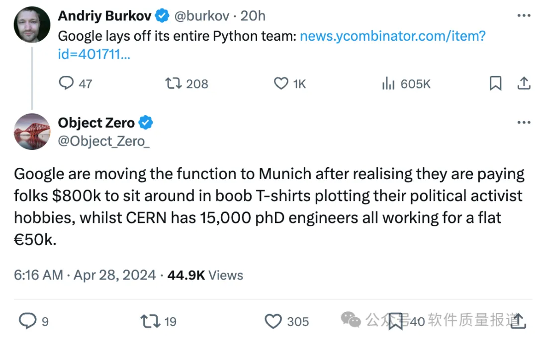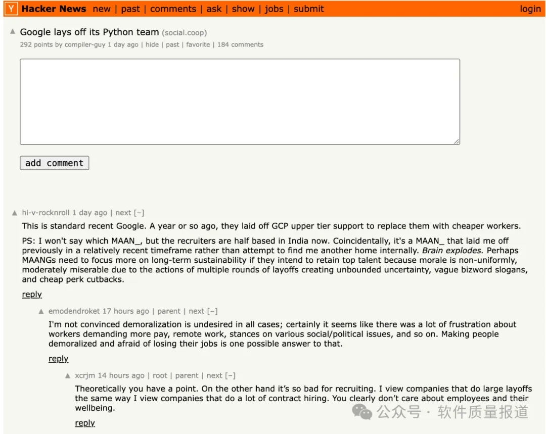 (谷歌意识到支付这批人年薪80万美元,只是让他们穿着宽松的T恤衫、策划他们的政治活动爱好,所以将这个职能团队迁移到慕尼黑,而CERN——欧洲粒子物理研究所有1.5万名博士工程师,他们都只拿着固定的5万欧元年薪。)还有同学说:这是最近的谷歌标准。大约一年前,他们解雇了 GCP 的上层支持,并用更便宜的工人取而代之。我不会说是哪个 MAAN_(Meta, Amazon, Apple, Netflix, and Google"),但招聘人员现在有一半在印度。巧合的是,正是 MAAN_ 在最近的时间范围内解雇了我,而不是试图在内部为我找到另一个家,头脑炸了。如果 MAANG 想要留住顶尖人才,也许他们需要更多地关注长期可持续性,因为多轮裁员造成了无限的不确定性,士气参差不齐,相当悲惨,模糊的流行口号和廉价的福利削减。回到标题的问题:谷歌裁了python整个 团队,预示着什么?意味着两点:- 在经济不是很景气的今天,任何企业都会关注“降本增效”,许多时候,优先考虑的是降低成本,这个简单,增效没有那么简单。