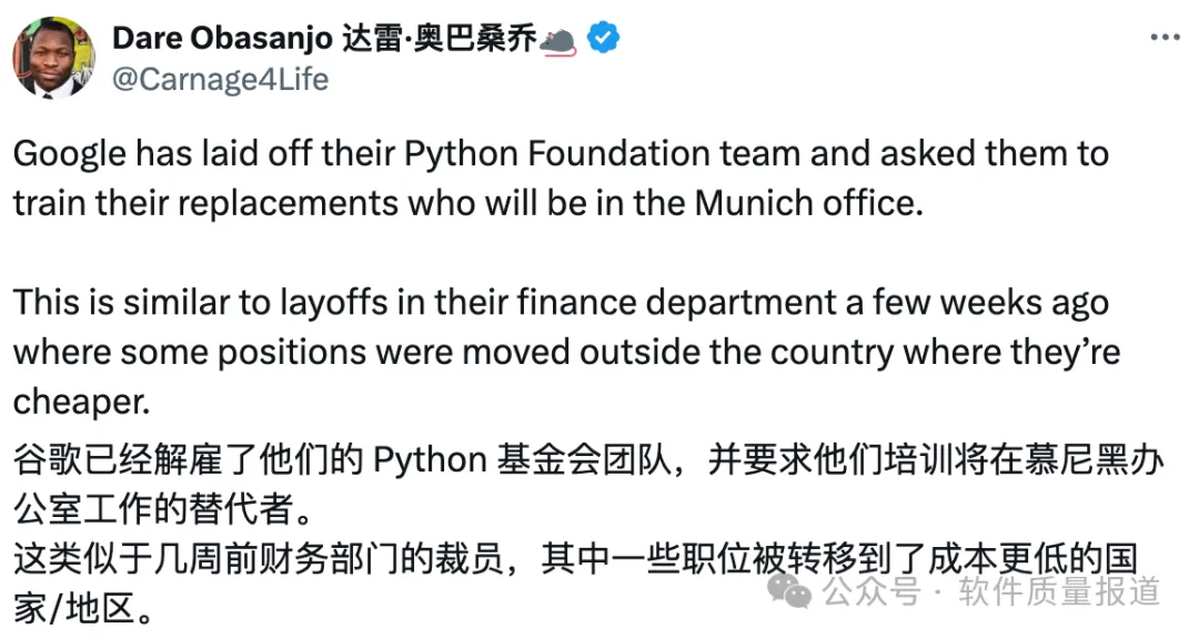 其实,和AI没有丝毫关系,这个Python团队也不是开发大模型或AI产品的。只是Google为了降低成本,将美国的团队裁掉,移到德国慕尼黑。