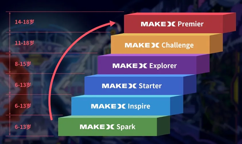 由于MakeX赛事系列源于国内,所以在政策支持上会比国外的赛事更有优势,MakeX按照年龄和能力划分了不同的六个不同层级的赛事,从小低年级到初中,年龄层覆盖更广,有完整的机器人体系规划和课程: