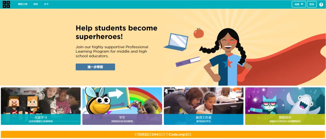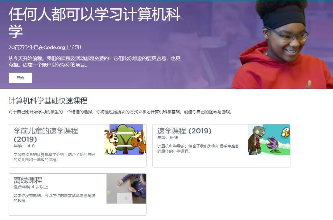 Code.org,是一个非营利组织创办的网站,目标是让每个学生都能像生物、化学和代数一样学习编程,而且每年会组织“编程一小时活动”,是当前为儿童提供免费编码课程的最受欢迎的网站。这个网站强烈推荐给大家,学前儿童就可以开始尝试啦,从最简单的鼠标拖拽开始。