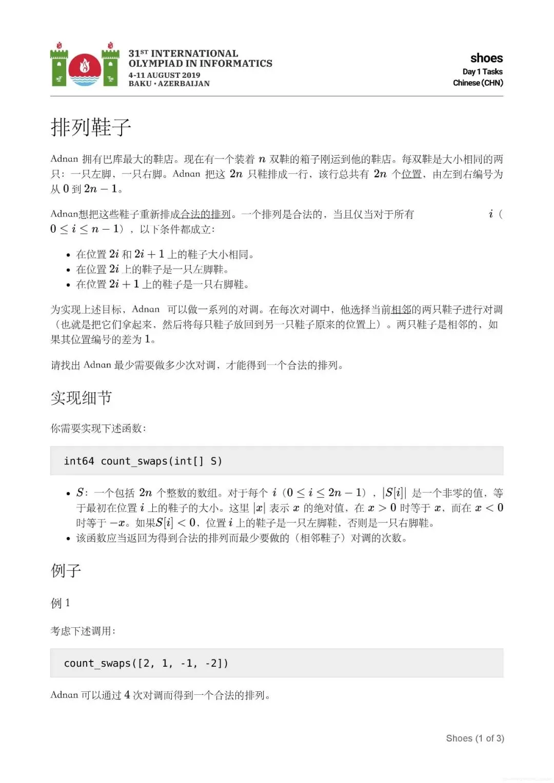 2019年国际信息学奥林匹克竞赛真题-排列鞋子