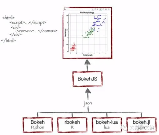 正如你所看到的,Bokeh捆绑了多种语言(Python, R, lua和Julia)。这些捆绑的语言产生了一个JSON文件,这个文件作为BokehJS(一个Javascript库)的一个输入,之后会将数据展示到现代Web浏览器上。