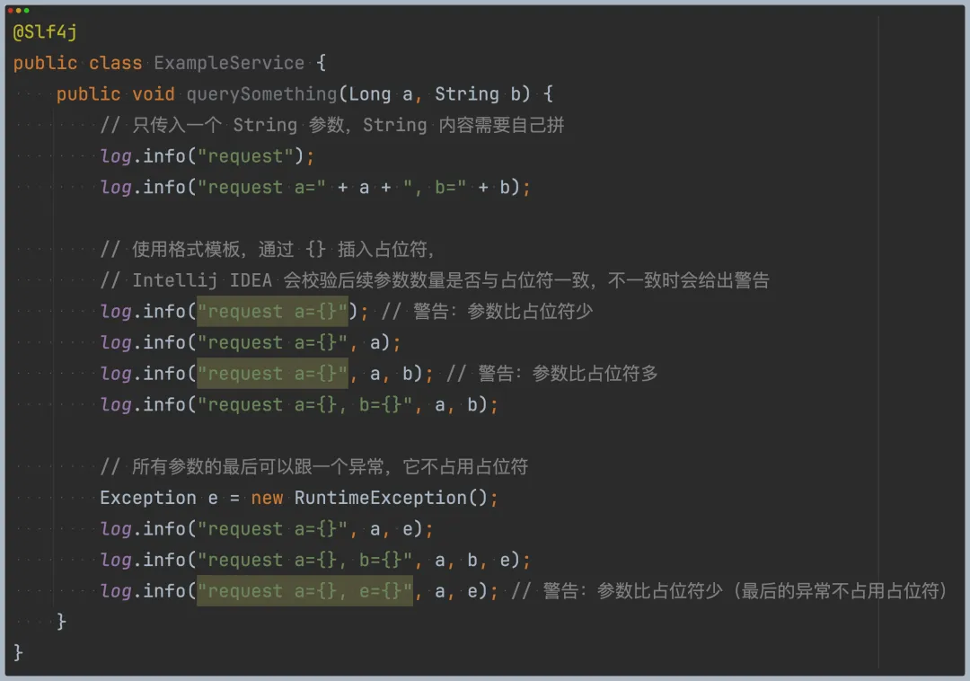 @Slf4jpublic class ExampleService {@Resourceprivate RpcService rpcService;public String querySomething(String request) {// 使用 trace 标识这个方法调用情况log.trace("querySomething start");// 使用 debug 记录出入参log.debug("querySomething request={}", request);String response = null;try {RpcResult rpcResult = rpcService.call(a);if (rpcResult.isSuccess()) {response = rpcResult.getData();// 使用 info 标识重要节点log.info("querySomething rpcService.call succeed, request={}, rpcResult={}", request, rpcResult);} else {// 使用 warn 标识程序调用有预期外错误,但这个错误在可控范围内log.warn("querySomething rpcService.call failed, request={}, rpcResult={}", request, rpcResult);}} catch (Exception e) {// 使用 error 记录程序的异常信息log.error("querySomething rpcService.call abnormal, request={}, exception={}", request, e.getMessage(), e);}// 使用 debug 记录出入参log.debug("querySomething response={}", response);// 使用 trace 标识这个方法调用情况log.trace("querySomething end");return response;}}