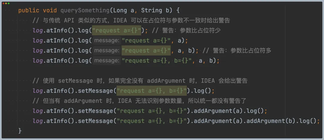 Marker marker = MarkerFactory.getMarker("foobar");Exception e = new RuntimeException();// == 以下几个示例的最终效果是完全一致的 ==// 这是传统的调用方式log.info(market, "request a={}, b={}", 1, 2, e);// Fluent API 例1log.atInfo() // 表示这是 INFO 级别。你猜对了,还有 atTrace/atDebug/atWarn/atError.addMarker(marker).log("request a={}, b={}", 1, 2, e); // 与传统 API 很像// Fluent API 例2log.atInfo().addMarker(marker).setCause(e).setMessage("request a={}, b={}") // 传字符串模板.setMessage(() -> "request a={}, b={}") // setMessage 支持传入 Supplier.addArgument(1) // 添加与字符串模板中占们符所对应的值.addArgument(() -> 2) // addArgument 支持传入 Supplier.log(); // 大火收汁// == addKeyValue 的输出格式依赖日志实现层的配置,默认格式与上边示例不同 ==// Fluent API 例3log.atInfo().setMessage("request") // 注意这里没有占位符.setKeyValue("a", 1) // 通过 setKeyValue 添加关心的变量.setKeyValue("b", () -> 2) // value 支持传入 Supplier.log();// 通过 setKeyValue 设置的值默认会放在 message 前边,比如上边这个例子,默认会输出:// a=1 b=2 request