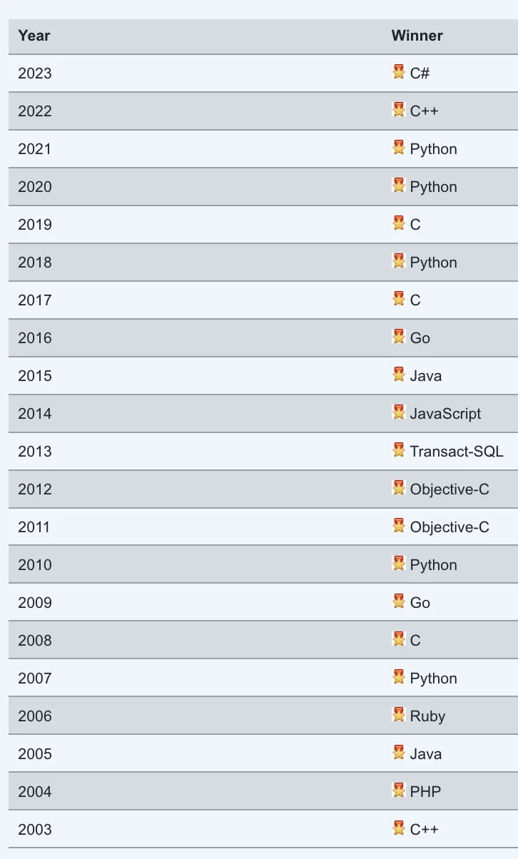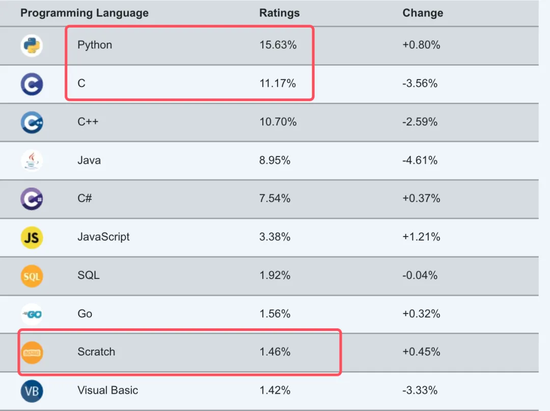 Python,C,C++,Java,C#,JavaScript,SQL,Go,Scratch,Visual Basic。