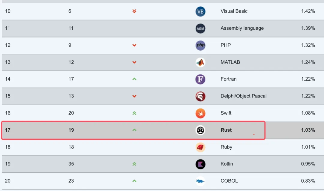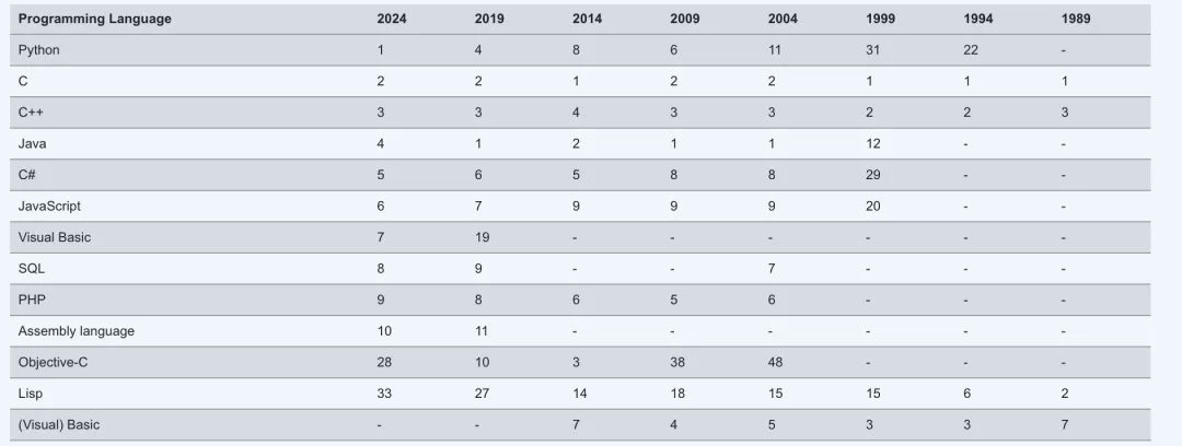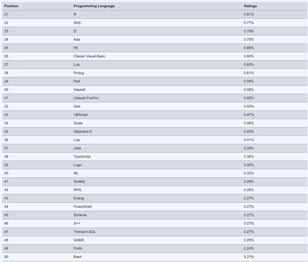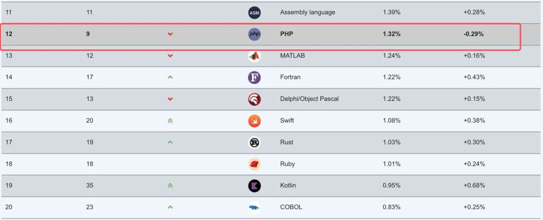 排名 11-20 的编程语言,PHP 已跌出前 10:ABAP, ABC, ActionScript, Algol, Apex, APL, Awk, bc, Bourne shell, Carbon, CFML, CHILL, CLIPS, Clojure, Crystal, Curl, DiBOL, Eiffel, Elixir, Groovy, Hack, Icon, IDL, Io, J, J#, JScript, LabVIEW, Ladder Logic, LiveCode, Modula-2, NATURAL, Nim, OCaml, OpenCL, OpenEdge ABL, PL/I, PL/SQL, PostScript, Q, Racket, REXX, Ring, Smalltalk, SPARK, SPSS, Tcl, VHDL, Wolfram, ZigTIOBE 每个月都会公布一次编程语言的排行榜,这份排行榜排名基于全球技术工程师、课程和第三方供应商的数量,其中包括了流行的搜索引擎以及技术社区,如 Google、百度、维基百科等等。