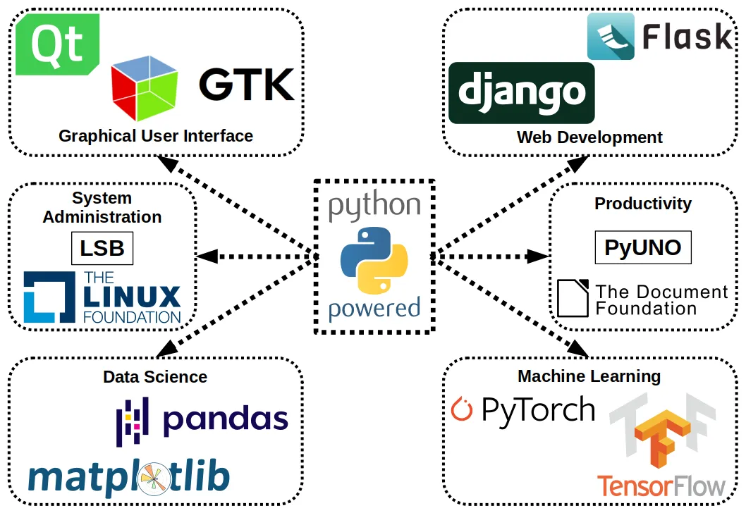 多样的应用领域:Python 可用于多种领域,包括 Web 开发、数据科学、人工智能、机器学习、科学计算、自然语言处理、网络编程等。其灵活性和通用性使得 Python 成为了一个全能的编程语言。