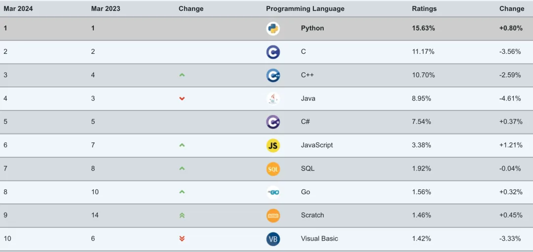 TIOBE 2024 年 3 月份的编程语言排行榜已经公布,官方的标题是:Python 与其他语言之间的差距从未如此之大(The gap between Python and the rest has never been that large)