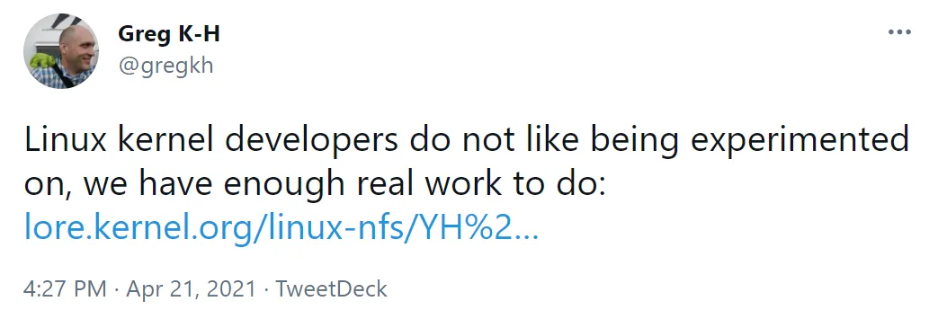 Greg Kroah-Hartman 是备受尊敬的 Linux 内核开发者之一,他在推特回复称:「Linux 内核开发者不喜欢『被实验』,我们要做的事情本来就够多了。」
